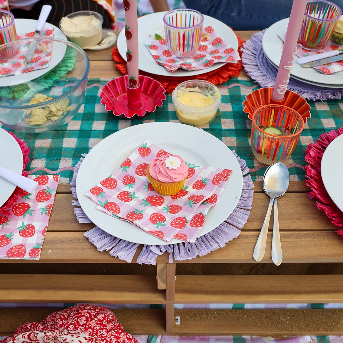 Servilletas de cuadros vichy lila fresa de Talking Tables. Mantenga dulces a sus clientes esta primavera con estas divertidas servilletas de frutas. Perfectas para picnics en el parque, fiestas de verano en el jardín y fiestas infantiles; simplemente deseche estas servilletas de papel en un contenedor de reciclaje una vez utilizadas.