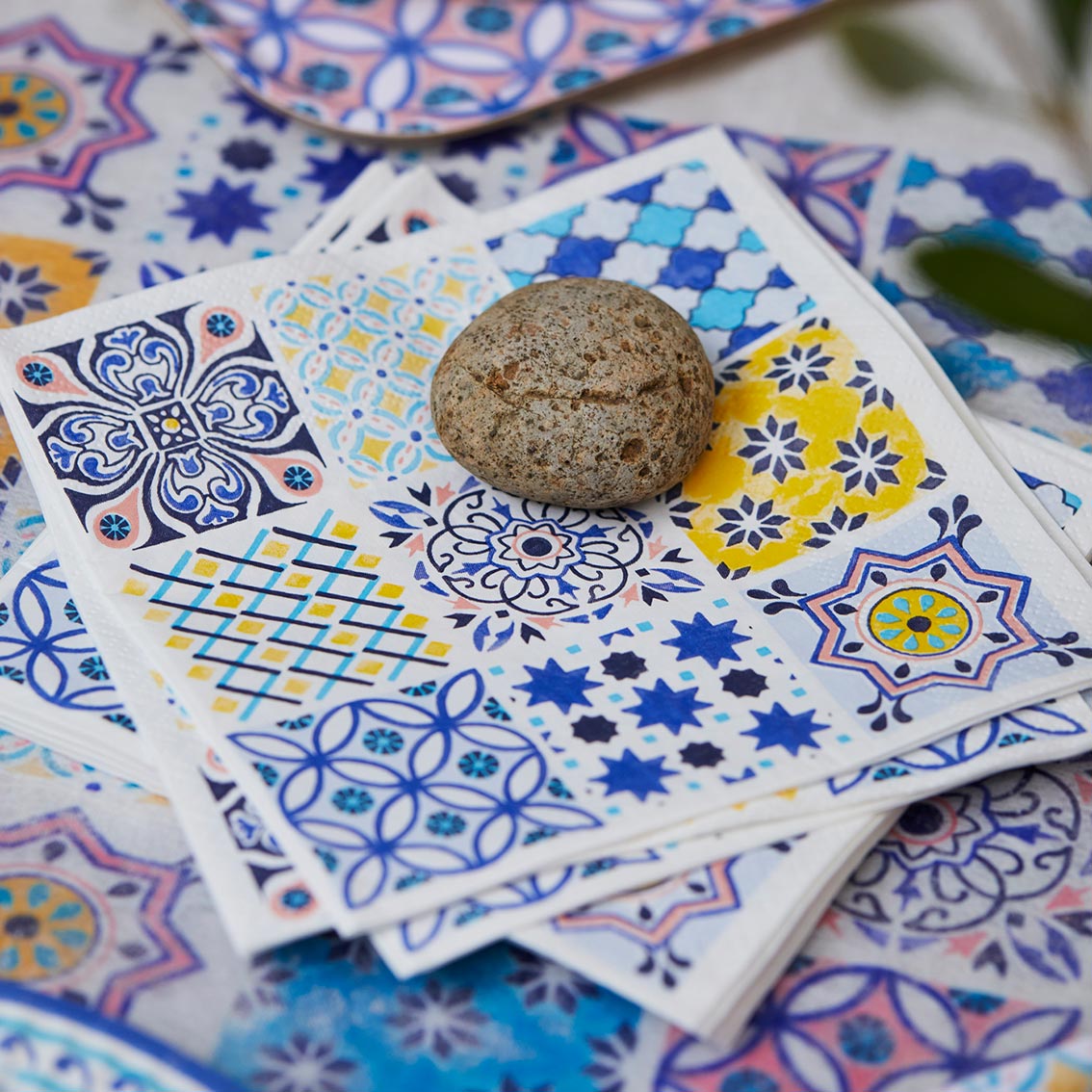 Pack de 20 servilletas Souk Blue Summer de Talking Tables. Inspiradas en los patrones brillantes y audaces que se ven en los zocos marroquíes, estas servilletas de papel azul seguramente serán un tema de conversación en su mesa de verano, ya sea un picnic, una barbacoa o una fiesta de cumpleaños de verano. Mejor aún, priorizamos que nuestros productos sean ecológicos y hemos diseñado estas servilletas desechables y sus envases para que no contengan plástico y sean reciclables.