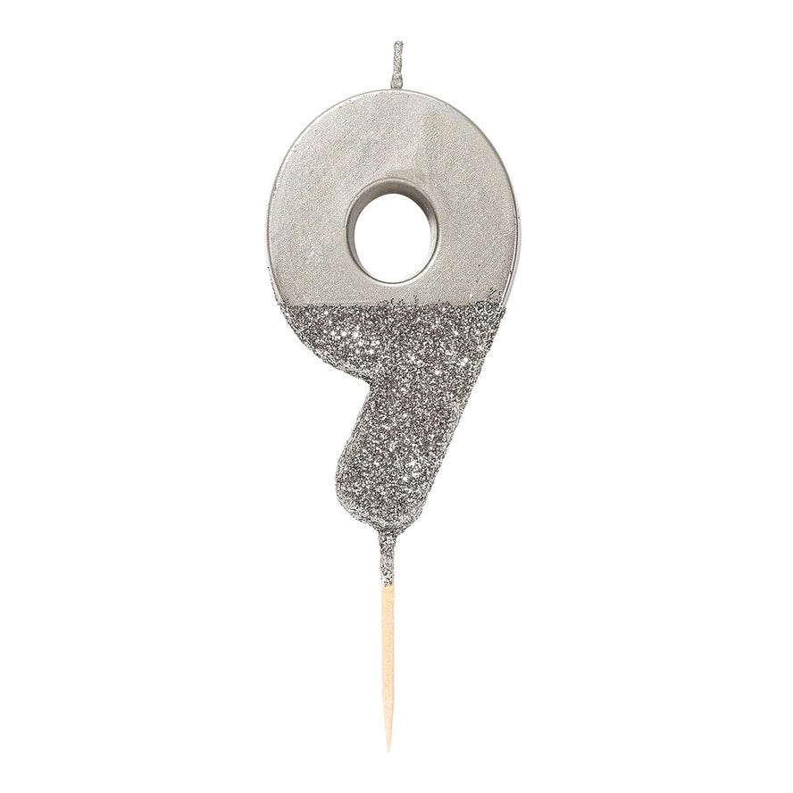 Celebra un día especial con elegantes velas numéricas plateadas, sumergidas en purpurina. Combina esta vela plateada número 9 con otros números. Nuestras velas de cumpleaños numéricas también están disponibles en otros colores.
