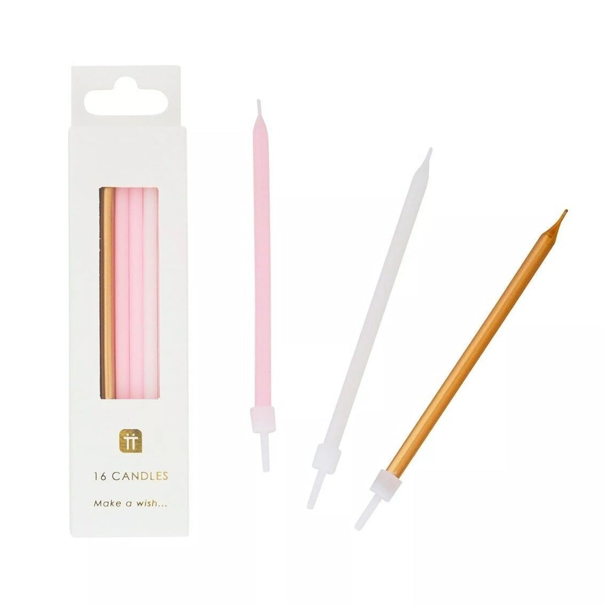 Contiene portavelas y 16 velas altas: 6 velas rosas, 6 velas doradas y 4 velas blancas